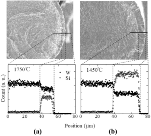 圖6硅化物在真空中保持2100℃下加熱1h后的EPMA圖及光譜分析(a)硅化物為W5Si3,(b)硅化物為WSi2