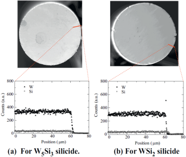 圖6為催化劑鎢表面的EPMA圖像,當(dāng)溫度超過(guò)1850℃時(shí),鎢表面轉(zhuǎn)化成了W5Si3(圖6(a));當(dāng)溫度低于1650℃時(shí),表面轉(zhuǎn)化成了WSi2(圖6(b));生成幾十個(gè)微米厚的硅化物后,在2100℃的真空中保持1h,兩種硅化物中的硅原子蒸發(fā)而完全恢復(fù)成了純鎢,鎢絲的直徑幾乎恢復(fù)到了原來(lái)的值。即使在W5Si3樣品中去除硅原子后,鎢的表面看起來(lái)似乎很光滑,但當(dāng)富硅硅化物一旦形成,可能因體積的膨脹的原因,導(dǎo)致鎢絲表面出現(xiàn)了很多裂紋。