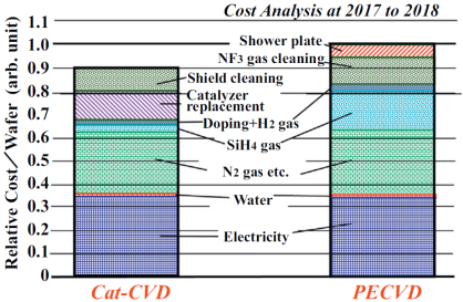 圖3為采用Cat-CVD和PECVD大規(guī)模生產(chǎn)SHJ太陽(yáng)電池的成本分析,是基于日本ULVAC公司最新的研討會(huì)上展示的大規(guī)模生產(chǎn)設(shè)備而得到的[20]。這項(xiàng)成本分析中,所有的基礎(chǔ)消耗成本,如天然氣、電力成本,均根據(jù)日本的數(shù)據(jù)評(píng)估的。