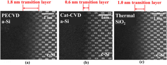 圖1不同界面的STEM圖(a)PECVD制備的a-Si/c-Si,(b)Cat-CVD制備的a-Si/c-Si,(c)熱生長(zhǎng)制備的SiO2/c-Si。從c-Si到a-Si或SiO2的過(guò)渡層寬度已被標(biāo)注